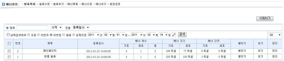 | ① 배너 하단의 ‘배너수정’ 버튼을 클릭하면 배너목록이 새창으로 뜹니다. |