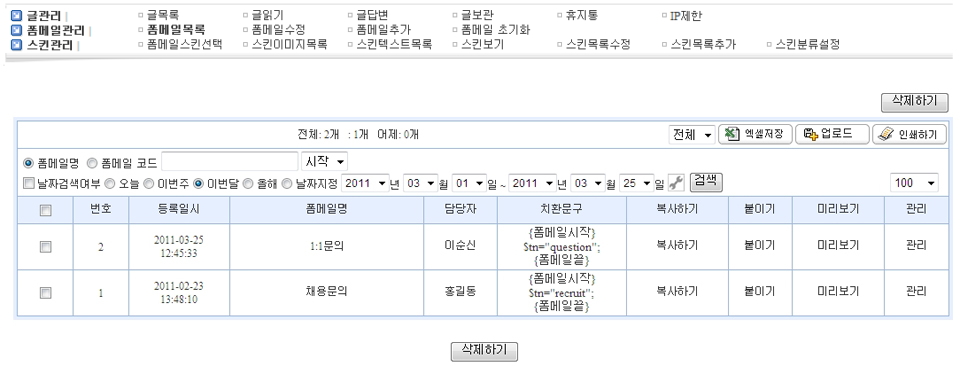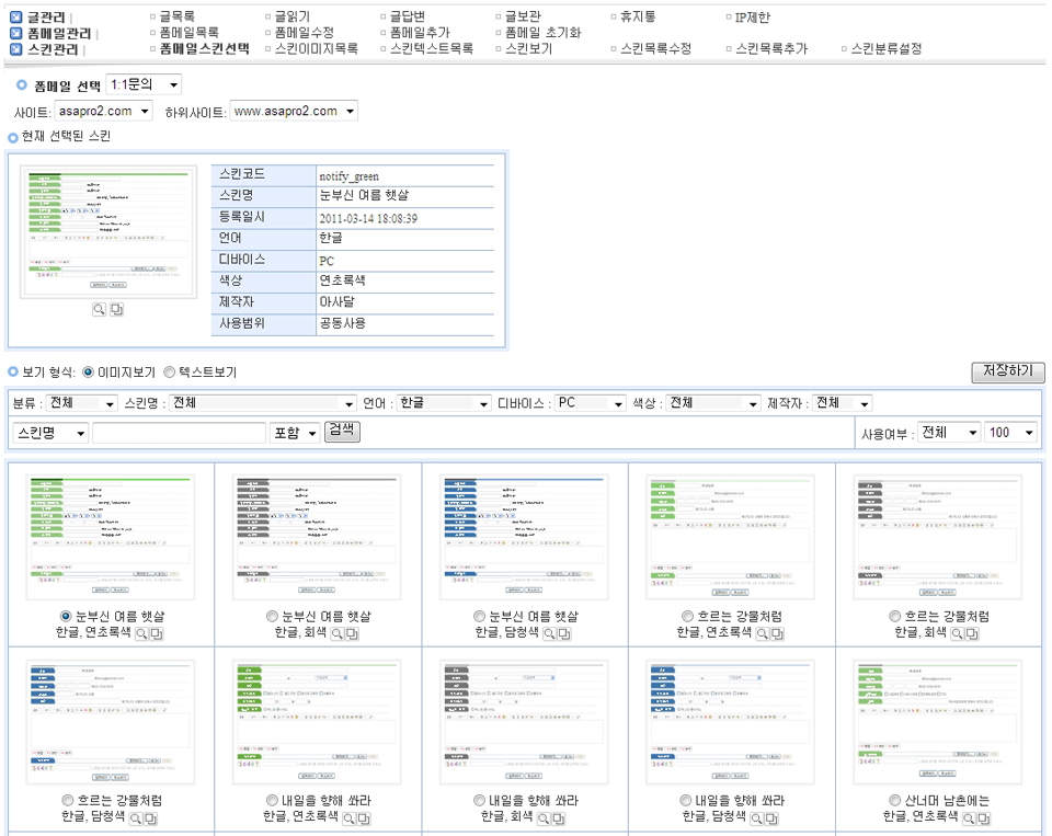 | (1) 폼메일스킨스킨은 특정 폼메일에 사용할 스킨을 지정하는 페이지입니다. |