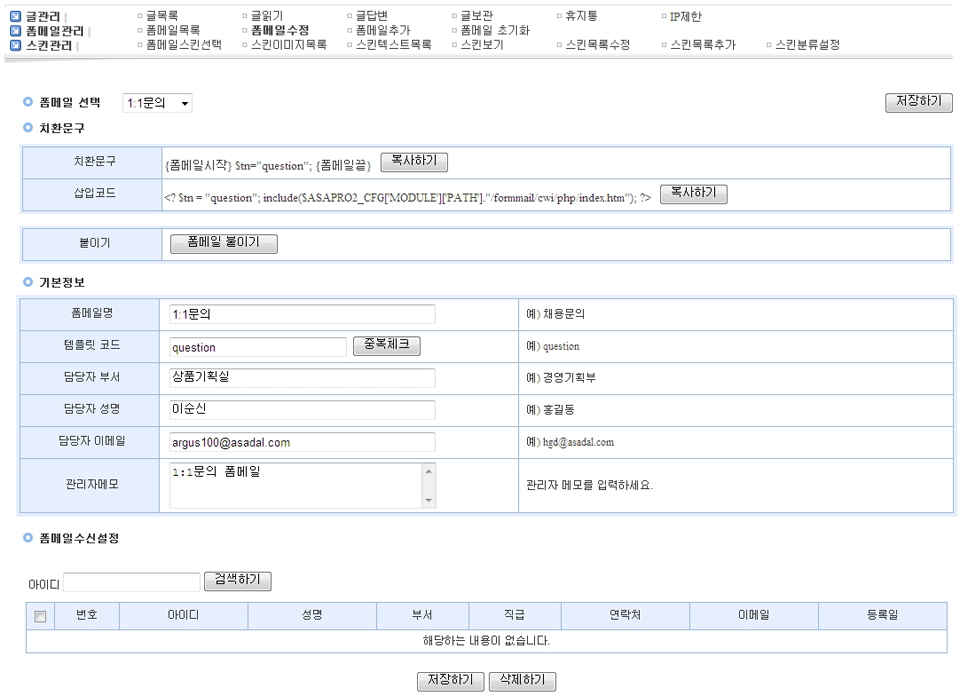 HOME > 호스팅 > 아사프로2.0 > 솔루션관리 > 폼메일관리 > 폼메일관리 |
