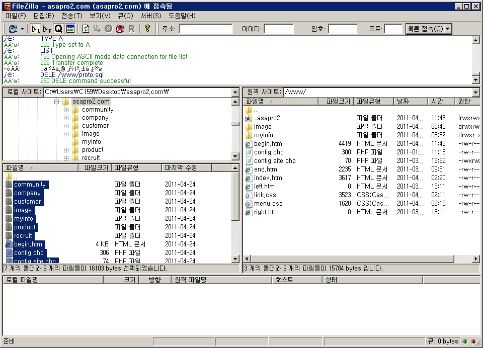| (1) 아사프로2.0이 설치된 계정에 FTP 프로그램을 이용하여 접속합니다. |