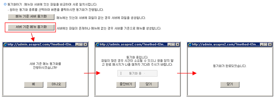 | (1) 메뉴관리 페이지 하단에 보면 동기화 버튼이 2개 있습니다. 이 중에서 [서버 기준 메뉴 동기화]를 클릭하면 서버에 있는 파일을 읽어서 메뉴에 자동으로 추가해 줍니다. |