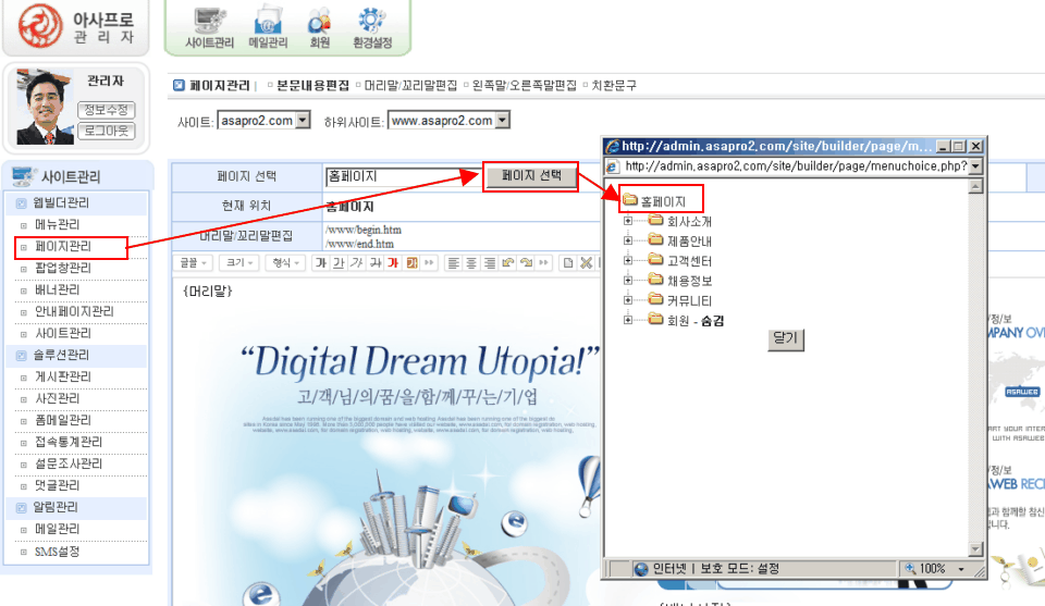 ② 관리자사이트 > 사이트관리 > 페이지관리 메뉴를 클릭하면 본문내용편집 화면이 나옵니다. 페이지 선택이 이미 메인페이지로 되어 있으면 바로 수정하면 되고, 다른 페이지가 선택되 어 있다면 페이지 선택 버튼을 클릭한 후 분류 중 제일 위에 있는 분류를 클릭하면 됩니다. |