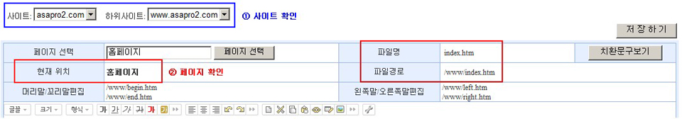 ① 수정하려는 페이지의 소속 사이트가 잘 선택되었는지 확인해야 합니다. 선택된 사이트 확인은 페이지 편집 화면 윗부분에 있는 사이트, 하위 사이트를 보시면 됩니다. 사이트를 잘못 선택한 경우 엉뚱한 페이지를 수정할 수 있습니다. |