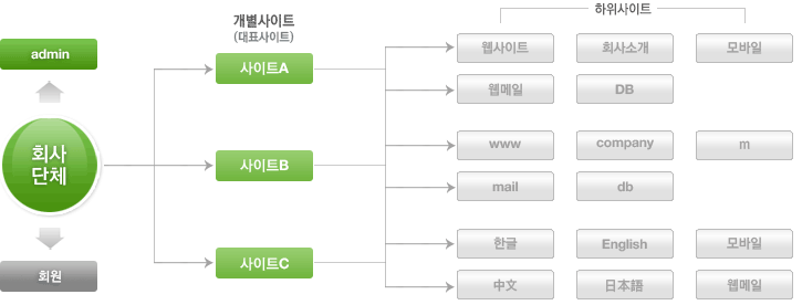 하나의 회사 또는 단체에서 여러 개의 사이트를 운영하는 경우에 단일한 관리자 사이트에서 통합된 회원제를 사용하면서도 동시에 여러 개의 하위 사이트를 통일적으로 관리할 수 있습니다. |