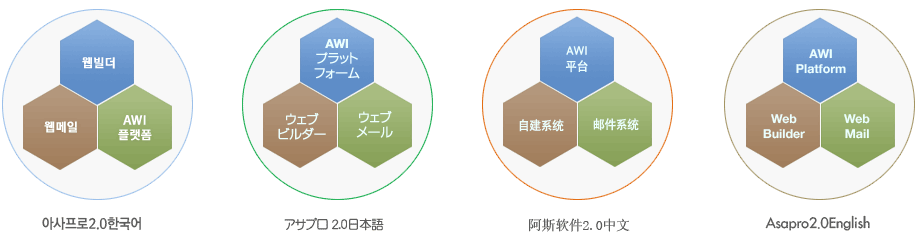 | ④ 다국어 웹빌더 : 아사프로2.0은 한글, 中文,日本語, English 등 다양한 언어로 된 홈페이지를 제작해 주는 다국어 웹빌더입니다. UTF-8 방식으로 되어 있어서 한 페이지에서 여러 언어를 자유롭게 섞어서 사용할 수 있습니다. |