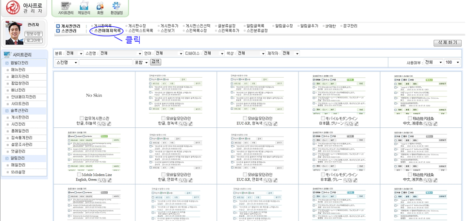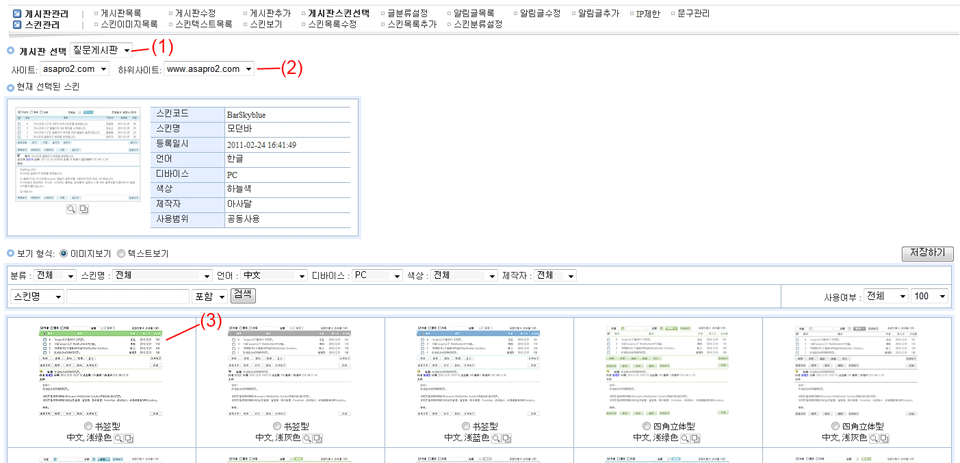 | ▸ 스킨관리모듈의 사용법은 http://hosting.asadal.com/asapro2/ 에 잘 나와있습니다. 스킨관리모듈 매뉴얼을 참고해서 스킨 정보를 입력하십시오. |