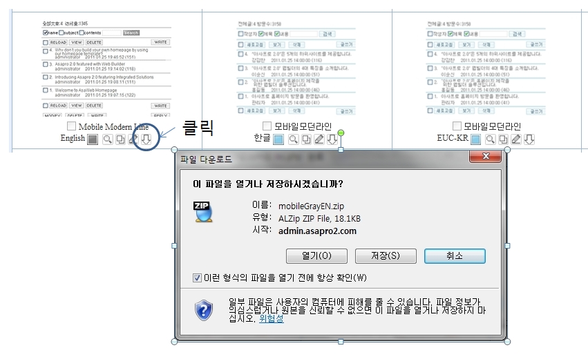 | ▸ 스킨을 처음부터 제작하려면 많은 시간이 소요됩니다. 따라서 아사프로2.0은 이미 제작된 스킨을 수정하여 사용할 수 있도록 스킨 다운로드 기능을 제공합니다. |
