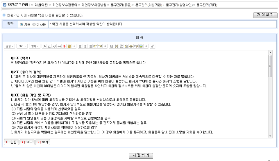 | 2. 약관의 내용을 수정하고자 할 경우에는 본문의 내용을 편집한 후 저장을 하면 사용자 페이지에 적용이 됩니다. |
