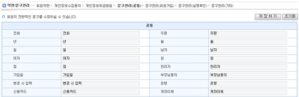 3. 문구관리는 회원에서 사용되는 문구를 관리자 원하는 문구로 수정하여 출력이 될 수 있도록 지정하는 기능입니다. “전화”를 “휴대폰”이라고 출력하려면 “전 화” 대신 해당 입력항에 “휴대폰”을 입력하고 저장하면 됩니다. |