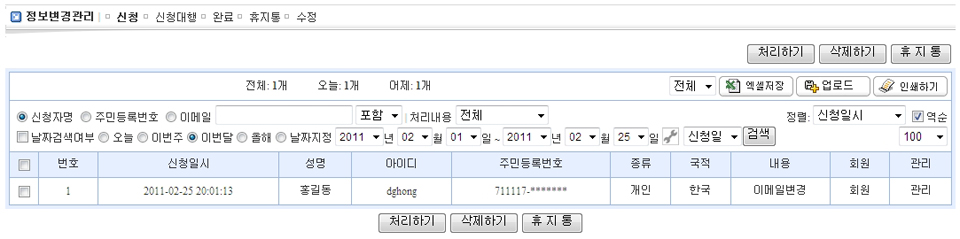 1. 정보변경관리는 “암호”, “이메일”, “회원탈퇴”, “실명도용신고”에 대한 관리 페이지입니다.