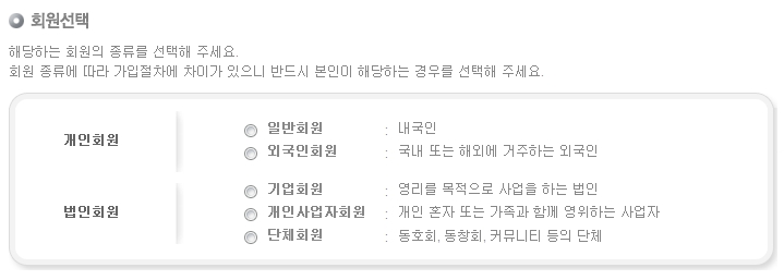 | 2. 회원의 종류선택 -> 약관동의 -> 실명인증 -> 회원가입 폼 작성 -> 회원가입 완료의 절차를 거쳐 가입이 완료됩니다. |