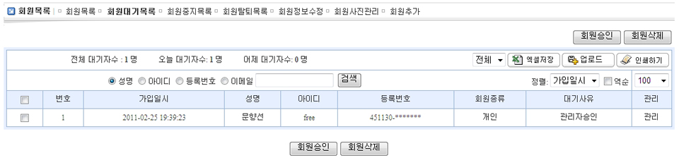 | (1) 회원대기목록 페이지에서는 관리자의 승인을 대기 중인 목록을 볼 수 있습니다. |