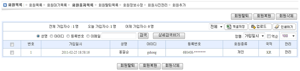 | (1) 회원중지목록 페이지에서는 현재 회원의 상태가 중지된 회원의 목록을 볼 수 있습니다. |