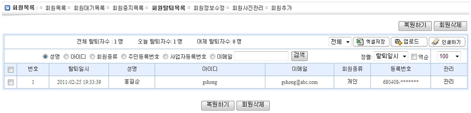 | (3) 목록의 체크박스에 체크를 한 후 “회원복원” 버튼을 클릭하면 해당 회원을 다시 진행상태로 바꿉니다. 복원된 회원은 로그인이 가능합니다. |
