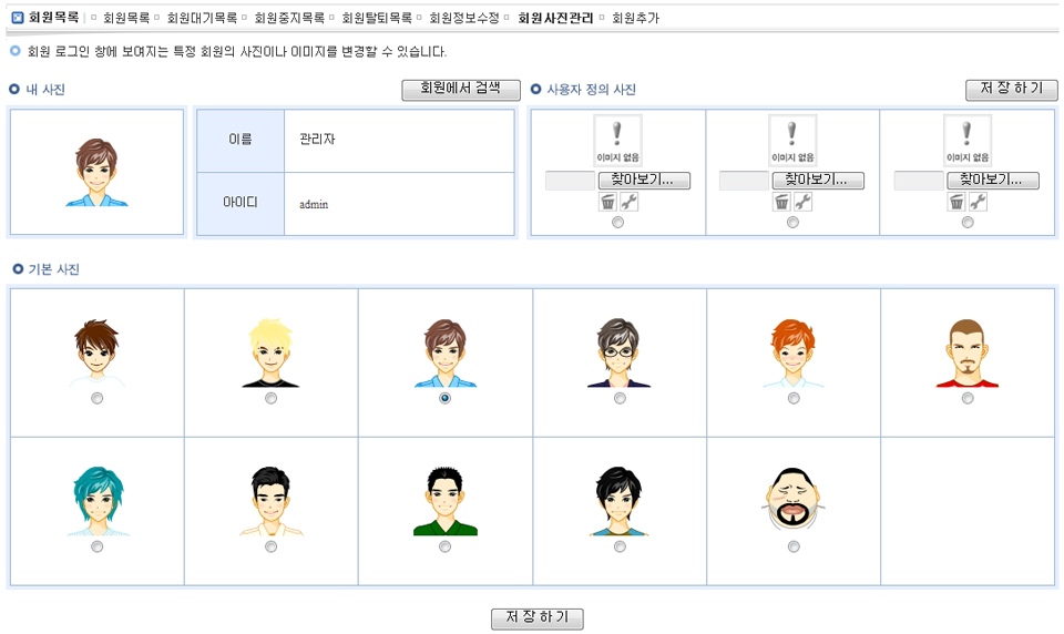 | (1) 회원사진관리 페이지에서는 관리자가 특정 회원의 사진을 수정할 수 있습니다. 물론 회원은 로그인 후 내정보 페이지에서 자신의 사진을 직접 사진을 수정할 수 있습니다. |