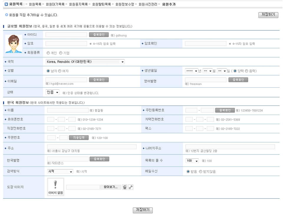 | (1) 회원추가 페이지에서는 관리자가 회원가입을 대행할 수 있습니다. 사용자 페이지의 회원가입과 동일한 가입폼이 출력되며, 해당하는 내용을 입력하면 회원가입이 완료됩니다. |