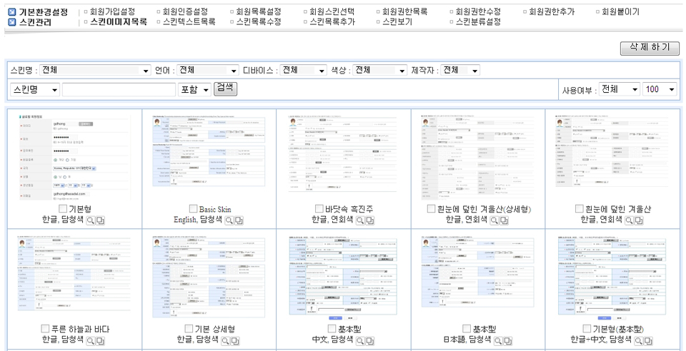 | (1) 스킨이미지목록은 회원관리에서 사용할 스킨의 목록을 이미지 형식으로 볼 수 있습니다. |