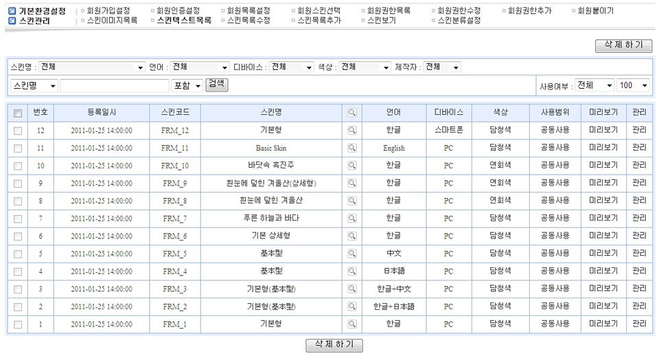 | (1) 스킨텍스트목록은 회원관리에서 사용할 스킨의 목록을 텍스트 형식으로 볼 수 있습니다. |