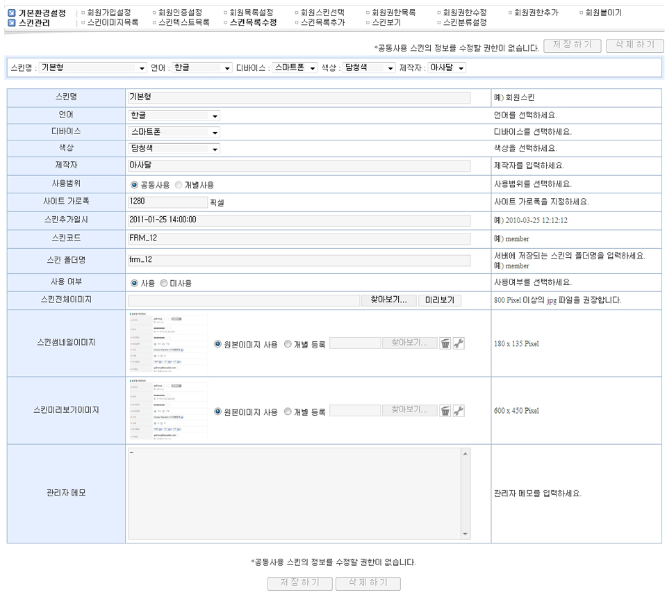 | (1) 스킨목록수정은 특정 스킨의 상세정보를 수정하는 페이지입니다. |