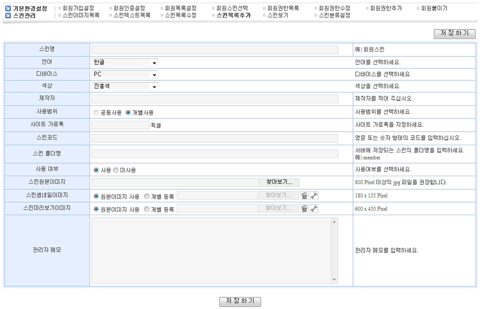 | (2) 관리자의 경우 스킨분류설정은 미사용입니다. |