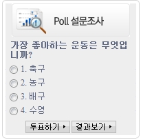 (1) 설문조사 투표하기는 다음과 같이 생성됩니다. 투표하기는 붙이기 기능을 이용하여 왼쪽 메뉴 아래, 본문 상단, 본문 하단 중에서 선택하여 붙일 수 있습니다. 치환문구나 삽입코드를 이용해도 원하는 어떠한 위치에 붙일 수 있습니다. |