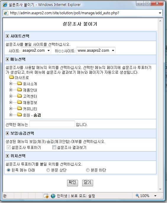 | (5) 위치선택에서 설문조사 투표하기를 페이지의 어디에 붙일지 선택합니다. 위치는 왼쪽메뉴 하단, 본문 상단, 본문 하단 중에서 선택합니다. |