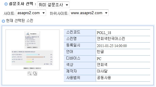 HOME > 호스팅 > 아사프로2.0 > 솔루션관리 > 설문조사관리 > 설문스킨관리 |