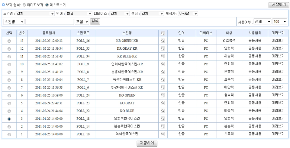 | (7) 텍스트보기를 선택하면 다음과 같이 스킨목록을 텍스트방식으로 볼 수 있습니다. |