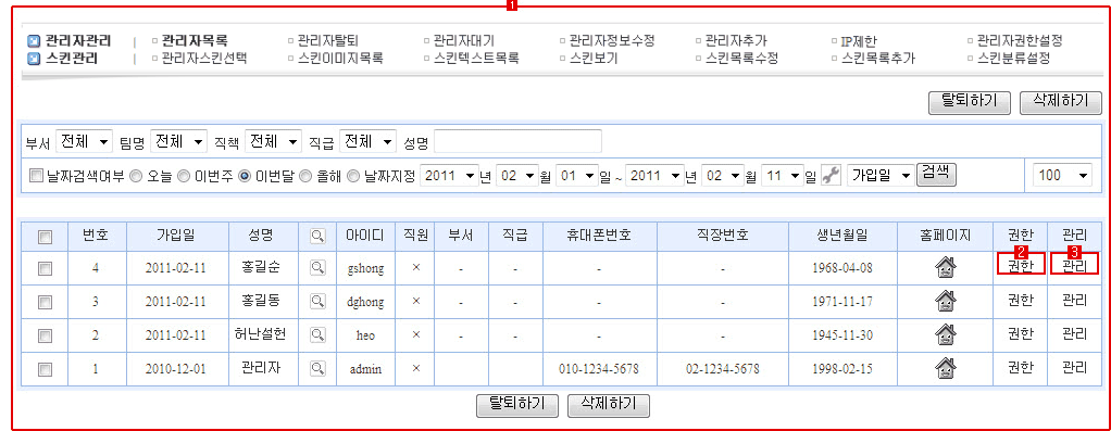 | (1) 관리자탈퇴 페이지에서는 탈퇴한 관리자의 목록을 볼 수 있습니다. |