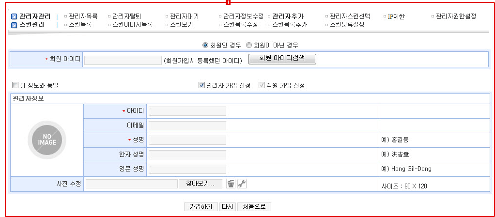 (1) 관리자추가는 관리자가 다른 관리자를 수동으로 추가하는 기능입니다. 관리자가입 페이지에서 가입신청서를 작성하지 않고, 관리자추가 페이지를 관리자가입 신청서를 작성할 수 있 습니다. |