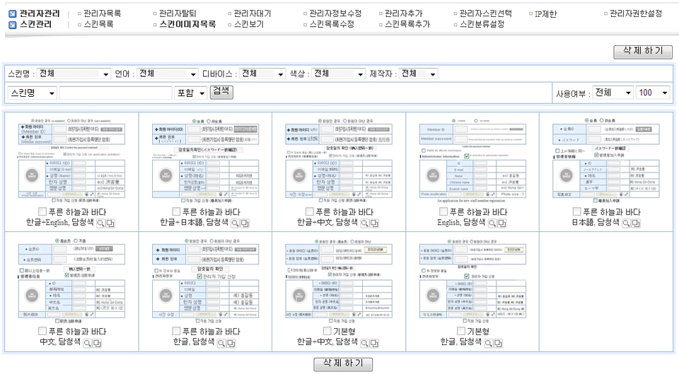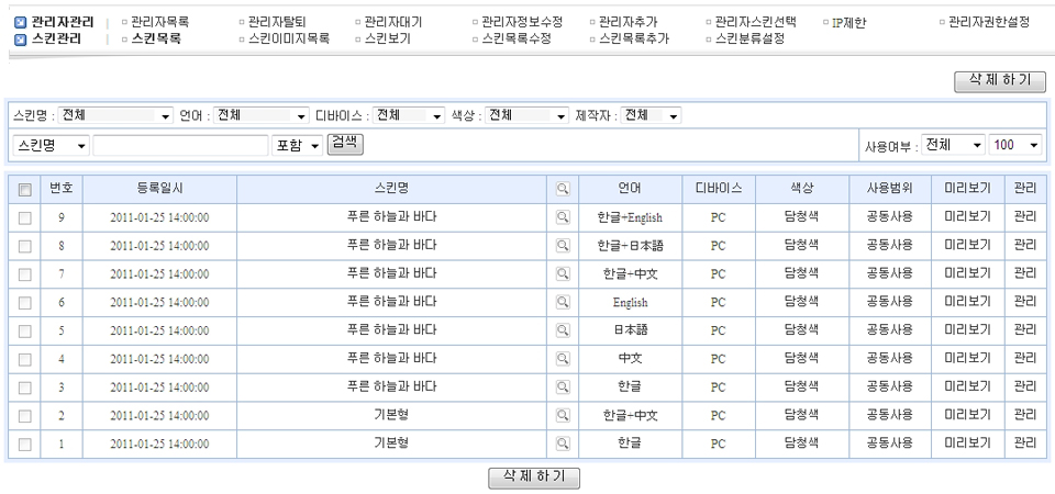 | (1) 스킨목록은 관리자에서 사용할 스킨의 목록을 열람할 수 있습니다. |