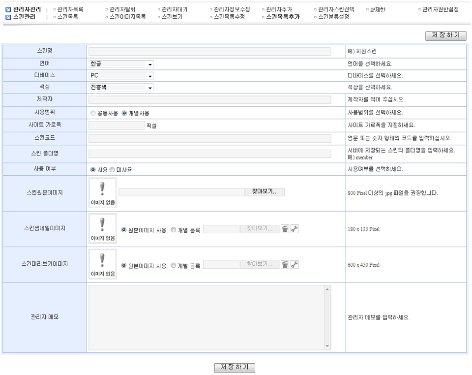 (3) 단, 스킨목록추가에만 정보를 등록을 하고 서버에 해당 파일을 추가하지 않으면 해당 스킨을 선택하더라도 정상적으로 반영이 되지 않습니다. 반대로 서버에 해당 파일을 추가했더라 도 스킨목록에 추가를 하지 않으면 해당 스킨을 선택할 수 없습니다. 반드시 서버에 파일을 올리고 해당 스킨의 상세정보를 스킨목록에 추가해야 합니다. |