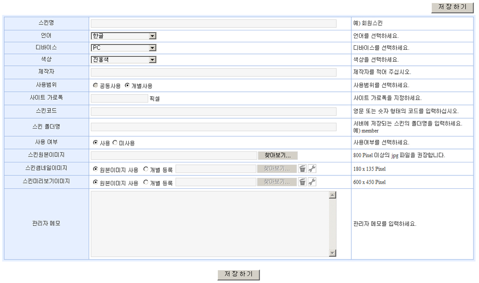 | (2) 스킨은 기본으로 제공되는 공동스킨과 고객이 직접 제작하여 등록한 개별스킨으로 구분됩니다. 기본으로 제공되는 공동스킨은 수정, 삭제할 수 없습니다. |