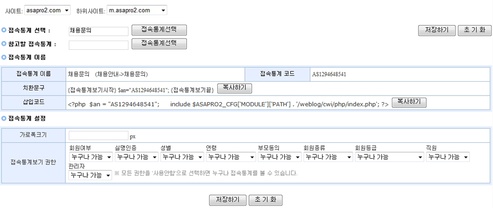 (1) 접속통계보기를 설정할 수 있는 페이지입니다. 가로폭 크기와 접속통계보기 권한을 설정할 수 있습니다.
