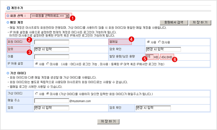 5) 할당 용량 : 추가하고자 하는 회원에 대하여 최대로 사용할 수 있는 용량을 제한합니다.