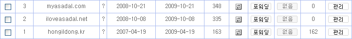 서비스 신청 후 로그인을 하면 내도메인 목록에서 아래와 같이 자신이 신청한 파킹, 포워딩 목록이 보입니다. 단, 처음 회원가입한 경우에는 도메인이 하나도 표시되지 않으므로, "도메인 추가" 버튼을 눌러서 추가해 주셔야 합니다. |