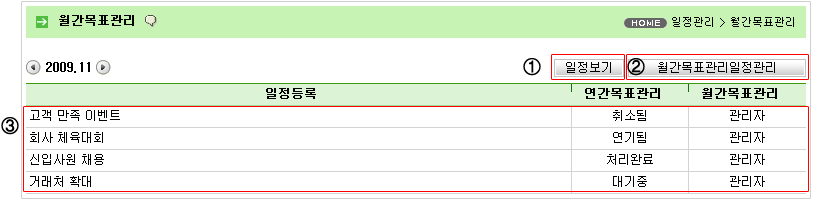 ① 일정보기 페이지로 이동합니다. ② 새로운 목표관리 내용을 등록할 수 있으며 페이지 구성은 다음과 같습니다. |