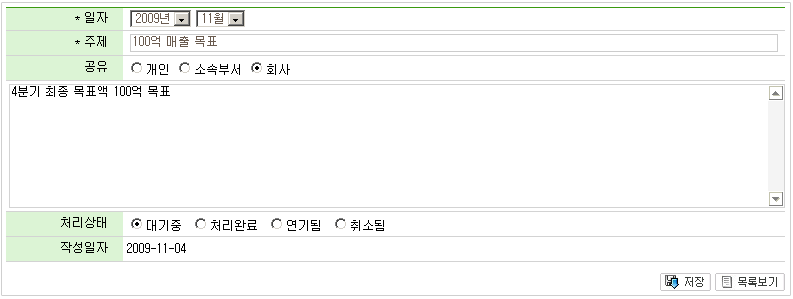 | *일자 : 목표 관리에 해당되는 월단위 정보 *주제 : 목표관리 제목 *공유 : 해당 목표관리를 공유해야 할 구성단위 |
