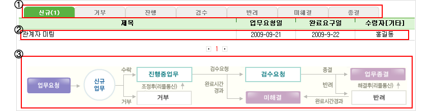 ① 업무함 별로 등록된 업무의 진행 상황을 볼 수 있습니다.. ② 등록된 업무 목록을 확인할 수 있습니다. ③ 일반적인 업무진행 절차를 설명하고 있습니다. |