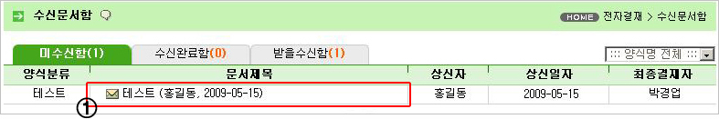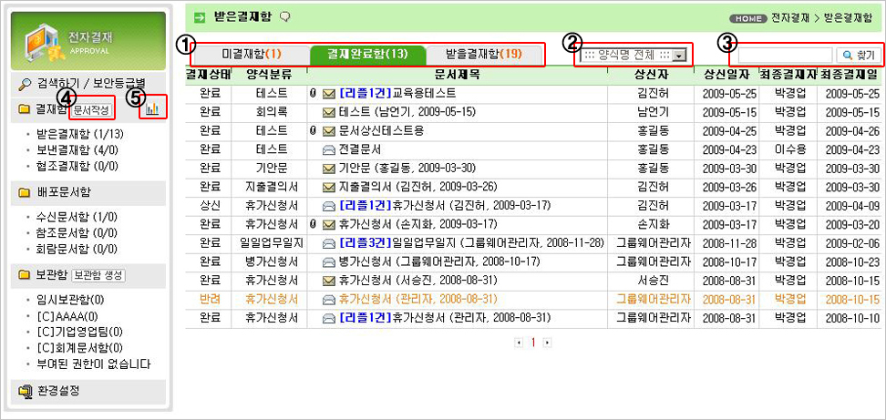 - 받은결재함 : 사용자가 직접 결재해야 할 문서들이 문서 모음입니다