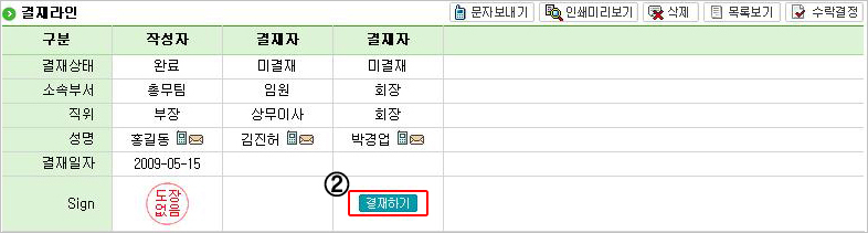 ② 결재해야 할 문서 확인 후에 결재하기 버튼을 클릭합니다.