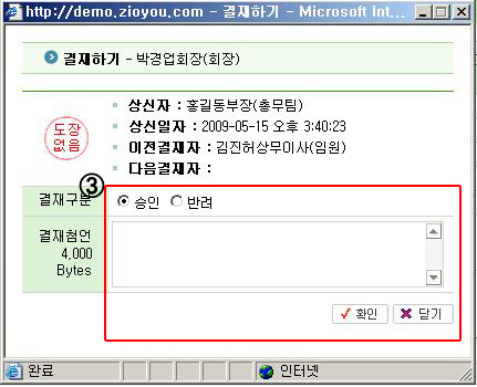 ③ 승인 또는 반려를 선택, 결재첨언 입력 후에 확인 버튼을 클릭합니다.