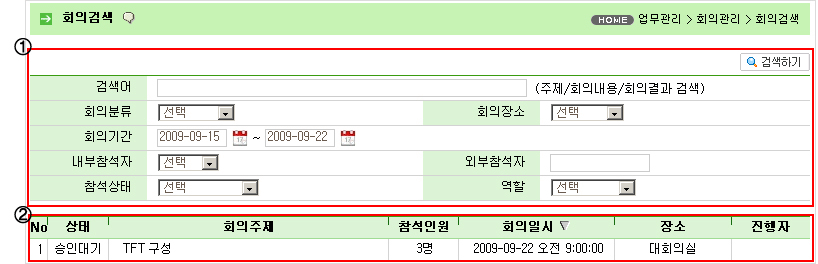 ① 검색을 원하는 회의 내용을 다양한 검색 조건으로 검색이 가능합니다. ② 등록된 회의 목록을 확인할 수 있습니다. |