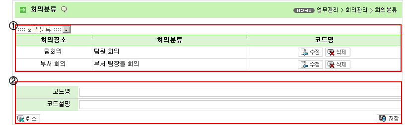 ① 등록된 회의분류 목록을 볼 수 있으며 수정 및 삭제가 가능합니다. ② 새 회의 분류를 등록할 수 있습니다. (코드명:회의분류 이름, 코드설명:회의분류 설명) |