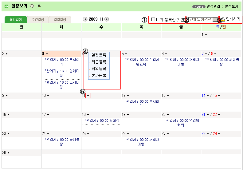 ② 다양한 카테고리(일반 일정, 외근, 회의, 휴가 등) 중에 선택하여 일정을 볼 수 있습니다. ③ 일정관리 출력이 가능합니다. ④ 해당 날짜를 클릭하면 카테고리별로 편리하게 일정을 등록할 수 있습니다. ⑤ "+"를 클릭하면 일정 제목만 빠르게 등록할 수 있습니다.
