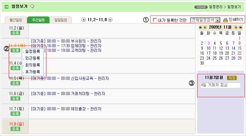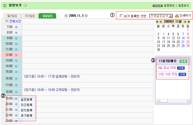 - 일일일정 : 구성원들이 등록한 일정을 일단위로 볼 수 있습니다. |