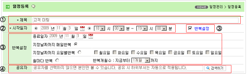 | 빠른일정과는 달리 다양한 설정을 주어 일정등록을 할 수 있습니다. |