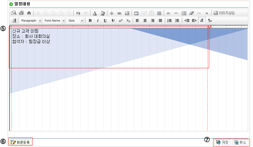② 등록할 일정의 시간을 기입합니다. ③ 일정에 대한 다양한 반복설정이 가능합니다. (매일, 요일별, 월마다, 반복개월수) ④ 작성할 일정을 공유할 구성원을 선택할 수 있으며 "검색하기"를 클릭하면 조직도가 나타납니다. ⑤ 일정 내용에 대해 상세히 기입합니다. ⑥ "빠른 등록"을 클릭하면 빠른등록 페이지로 이동합니다. ⑦ "저장"을 클릭하면 일정이 정상적으로 등록되며 "취소"를 클릭하면 일정등록이 취소됩니다. |