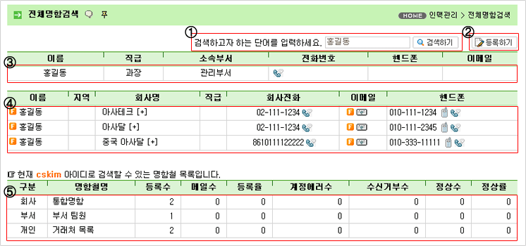 ① 검색을 원하는 검색어를 입력하고 "검색하기"를 클릭하면 아래와 같이 검색결과가 나타납니다. ② "등록하기"를 클릭하면 새로운 명함을 등록할 수 있습니다. ③ 그룹웨어 내에서 검색된 검색결과를 볼 수 있습니다. ④ 명함철 내에서 검색된 검색결과를 볼 수 있습니다. ⑤ 현재 아이디로 검색할 수 있는 명함철 목록을 볼 수 있습니다. |