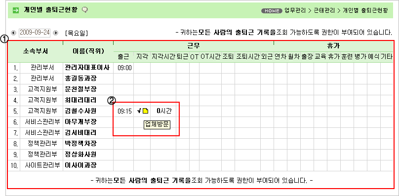 ① 근태와 관련된 정보를 볼 수 있으며 모든 구성원의 근태 정보를 열람할 수 있는 관리자은 위와 같이 화면이 구성됩니다.